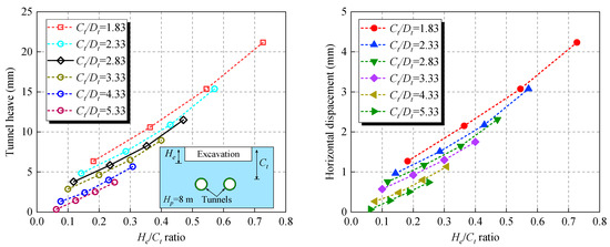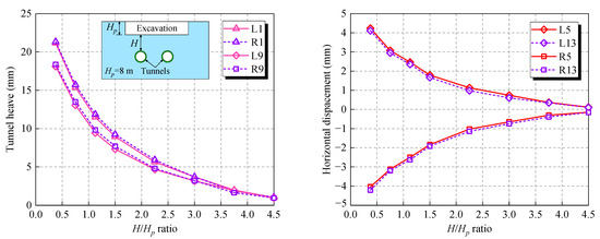 As the clearance (H) between the bottom of the foundation pit and the crown of the tunnel increases, the impact on the tunnels caused by the excavation and unloading would gradually decrease. The tunnel displacement responses with variations of the H/Hp ratios are analyzed in depth. The H values are set as 3 m, 6 m, 9 m, 12 m, 18 m, 24 m, 30 m, 36 m in the numerical runs, and the monitoring point arrangement is the same as Figure 5 descripted previously. Figure 16 shows the variations of tunnel heaves and horizontal displacements with different H/Hp ratios after the excavation completed. The results confirm that both the tunnel heaves and horizontal displacements gradually decrease with the increase in the H/Hp ratios, and the tunnel heave is much larger than the horizontal displacement. The heave and horizontal displacement differences of the tunnel gradually decrease with the increases in the H/Hp ratios. The tunnel heave is less than 2 mm when the H/Hp ratio is greater than 3.5, at this time the influence of excavation unloading on the tunnel deformation responses is marginal.