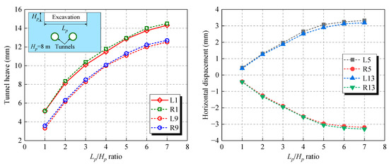 Figure 17 presents the relationship between the tunnel heave, horizontal displacement and varying Lp/Hp ratios, with a final Hp value of 8 m. The Lp values along the transversal tunnel direction are assumed to be from 8 m to 56 m, so as to explore geometrical effects of an excavation on tunnel responses. At a given Hp value, the tunnel heave and horizontal displacement are found to increase with increase in the Lp/Hp ratio, but at a reduced rate. The maximum heave and horizontal displacement are obtained when the Lp/Hp ratio is 7. In this case, the tunnel heave and horizontal displacement at stage 1 increases from 5.16 and 0.45 mm, to 14.5 and 3.33 mm at stage 8 (181% and 640% change, respectively; note only the larger values of these two indicators in twin-tube tunnels are presented), which proves a more significant effect on horizontal displacement increasement. Moreover, the maximum incremental tunnel heave and horizontal displacement are less than 4.1% and 2.4% when the Lp/Hp ratio varies from 6 to 7. It is demonstrated that the increased Lp values contributing to developments of tunnel heave and horizontal displacement are marginal when the Lp/Hp ratio larger than 6. Due to a more positive response of tunnel horizontal displacement, countermeasures may be necessary to minimize the adverse impact of excavation on existing tunnels.