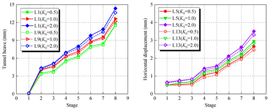 It is well recognized that the coefficient of lateral pressure (the horizontal/vertical stress ratio, K0) may lead to different mechanical responses of underground engineering structures [38,39]. In this section, the effect of varying K0 values on tunnel displacement responses is examined, thereafter the K0 values of 0.5, 1, and 2 are considered, with the tunnel and excavation geometries in prototype scale being modeled. The calculated tunnel heave and horizontal displacement at different stages with varying K0 values are shown in Figure 19. This indicates that increasing the K0 significantly increases the effect of the excavation on the tunnel displacements. At each K0, excavation-induced tunnel heave and horizontal displacement are both increased as the excavation proceeds, and the maximum values are obtained at the last stage, as expected. At each stage, the tunnel heave and horizontal displacement both experience increases at an increased rate as the K0 values increase from 0.5 to 2.0. The terminal values also increase with increasing K0 values, so the maximum tunnel heave and horizontal displacement are simultaneously obtained when the K0 is 2. Increasing K0 results in a more significant increase in tunnel heave than horizontal displacement.