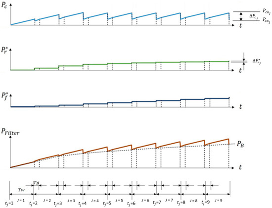 After the filter is cleaned, the total pressure drop is the sum of the pressure drop of the filter , the pressure drop of the residual powder cake , and the pressure drop of the temporary powder cake , as shown in Equation (14). Generally, more filter groups and a lower dust concentration have some unobvious changes in pressure drop before and after cleaning on the temporary powder [33]. Therefore, we use the baseline of the pressure drop as the sum of the pressure drop of the temporary powder , after cleaning, and , as in Equation (15).
