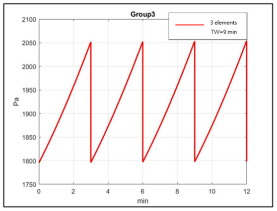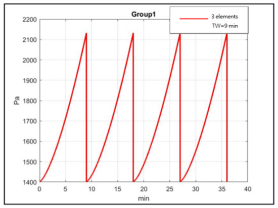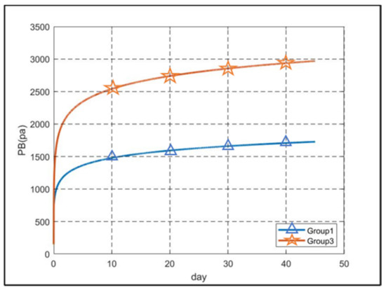 To further confirm the availability on the model with , this study used the data to verify it in two experimental modes [35], namely Group1 and Group3. Group1 is an operation mode that cleans three filters at the same time when the pulse interval time is 9 min. Group3 is to clean only one of the three filters in order when is 3 min. The filtration speed of the filter in the system is maintained at . The dust used for filtration is fly ash with , and the dust concentration . It selected , in the simulation of Group3, and , for Group1.
