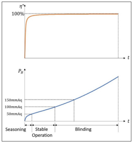We divide the state of the filter into a filtering and a cleaning period. During the filtering period, the flow according to the flow, speed, and area can be calculated as shown in Equation (8), where N is the number of filter groups, is the filter area of each filter group, and is the gas flow of the filter [34].