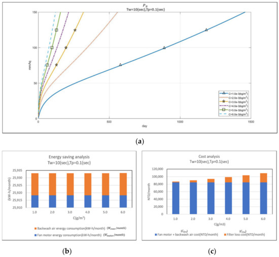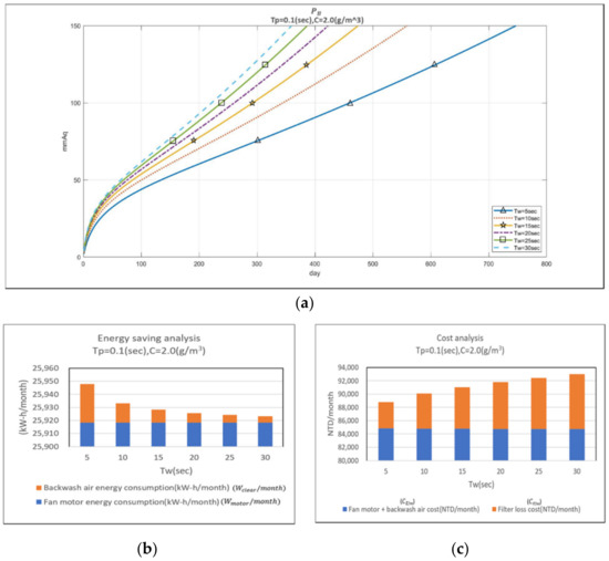 This test is to evaluate the energy consumption generated by different pulse interval times under the constant of dust concentration and pulse time , where setting , , . When = 5 -747 days (the filter has a service life of 747 days), it obtains = 10 -559 days, = 15 -474 days, = 20 -422 days, = 25 -386 days, and = 30 -359 days, as shown in Figure 8a. According to the results, it is found that Tw is getting longer, and the service life of the filter will be shorter with the pressure drop to . In the analysis of energy consumption, as shown in Figure 8b, we can observe that a different has little effect on the monthly energy consumption of the fan motor. Conversely, a decrease in the causes an increase in the number of cleanings, which will significantly increase the energy consumption of the compressed air for backwashing. In the analysis of cost, as shown in Figure 8c, we can observe that a different has little effect on the electricity cost of the fan motor and the high-pressure backwash air due to the change from the fan motor mainly manifested by and Based on the results, the parameter of will not be considered on energy saving but for cost, and = 5 is the best parameter setting for the simulation. However, considering that Tw is too short, it will cause frictional damage when the pressure drop is not to 150 mmAq. Therefore, according to this, the study recommended that the parameter = 10 may be a better choice based on the actual use conditions to reduce the cost of cleaning by half.
