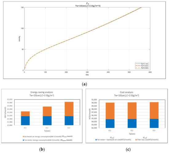 This test is to evaluate the energy consumption generated by different pulse times under the constant of and , where setting , , . The result can be observed that the filter has a service life of 559 days as , and different values do not affect the service life of the filter until pressure drops to , as shown as Figure 9a. On the other hand, this shows that different values have little effect on the energy consumption of the fan motor, as shown in Figure 9b, but increasing will increase the amount of energy consumption in monthly backwash compressed air. In the analysis of cost, this study found that a different has little effect on the electricity cost from the fan motor and pulse-jet cleaning, as shown in Figure 9c. It also does not affect the cost of the filter. Therefore, as long as the appropriate pulse pressure is set appropriately, the will not affect the cleaning efficiency of the dust collector. For energy saving, this study considers to be the better parameter.