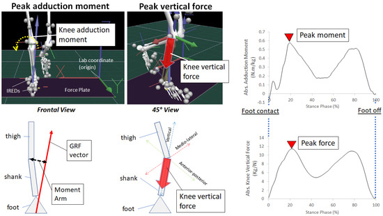 As shown in the top right panel of Figure 1, the knee adduction moment has two peaks corresponding to the foot–ground reaction forces exerted at foot contact and push-off [18,19]. The adduction moment, described using negative values, causes tibial and femoral abduction but body weight and limb length are also determinants of joint moments and, various normalisation techniques have been proposed to account for the subject’s anthropometric contribution to adduction moments. There are, however, cautions concerning the risk of normalisation techniques washing out important information [20].