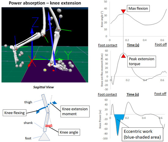 Sagittal plane knee kinetics. (Top right): Knee joint angle during stance phase. (Middle right): Knee extension torque. (Bottom right): Power absorption and eccentric work.