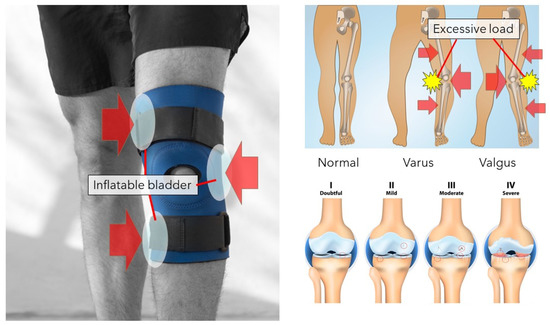 Various knee orthoses are commercially available, but many of them only provide joint stabilisation by strapping and compression, which can, nevertheless, be useful for injury prevention and pain management [33,34]. More specialised products incorporate abduction–adduction control, for example, by using inflatable bladders to regulate knee motion [35]. Figure 3 illustrates an inflatable bladder application (left) for both varus and valgus OA (top right) and, adjustable pads and condylar pads are also commonly used to control abduction–adduction moments [36]. In general, these knee braces are effective in reducing knee adduction moment and easing OA symptoms, but Khosravi et al. [35] also reported that long-term use of a bulky knee orthosis could cause discomfort such as skin irritation.