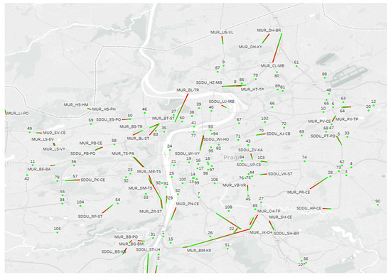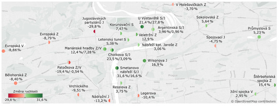 The effect of tunnel closing clearly leads to an improvement within the tunnel, but has a strong negative impact on the traffic around the tunnel, in the rest of the city. This is described by Faltus and Hrdina in [18] and demonstrated in Figure 8. The green points denote sensors for which the average speed increased after opening the tunnel complex Blanka; the red points mean decrease in average speed. Always, the change in percent is presented. The full circle denotes the sensor that measures in one direction only, the split circles show values in both directions.