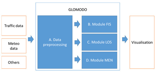 Project GLOMODO consists of several modules whose aim is to give a road operator or a city manager better understanding of the traffic situation. As depicted in Figure 3, apart from data preprocessing aiming mainly on identification and correction of missing data and outliers, there are three modules: Module FIS computing the cost of congestions; Module LOS providing a level of service indication based on so-called speed index [13]; and Module MEN aiming on identification normal behavior of traffic flow and warning the operators in case of any non-standard traffic patterns.