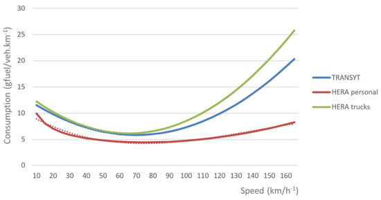 Comparison of fuel consumption (in liters per 100 km) according to models HERA COPERT and TRANSYT.