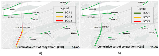 The cumulative cost of congestions (in CZK) and the level of service (LOS 1—green; LOS 2—yellow; LOS 3—red) as computed for an example network in Prague at (a) 8 a.m. and (b) 11 p.m.