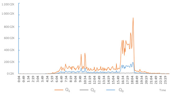 An example demonstrating the split of the cost of congestions (in CZK) to particular contributing factors Q_i during the day.