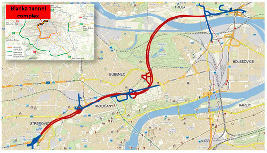 Nowadays, tunnels are typically controlled by the second approach. It is, however, usually performed manually and often in a binary matter. In case queues are forming in a tunnel, the police decide to close the tunnel. This principle is demonstrated on a case study of an urban road tunnel complex Blanka (Prague, Czech republic), which is depicted in Figure 7. It is an important part of the (still not finished) Prague city ring and it was built to lighten the traffic in the central historical areas of the city. The tunnel complex is 5.5 km long and it is composed by three underground tunnels (red lines in the Figure 7). The opening of the tunnel complex Blanka in 2015 had a major impact on traffic in the city and clearly demonstrated need to take such tunnel complex as a part of the city.