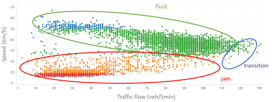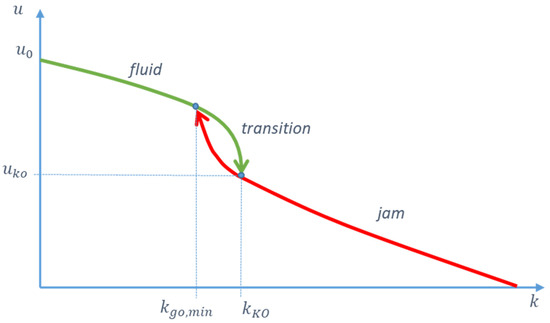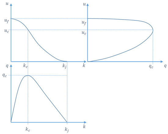 In order to develop an optimized traffic control strategy, it is necessary to look at the characteristics of traffic flow. The traffic flow is characterized by three basic variables [20]: flow rate q, density k and mean speed u. Due to the fundamental relation there are only two independent variables. The relationship among the variables is often depicted using so-called fundamental diagrams (see Figure 9).