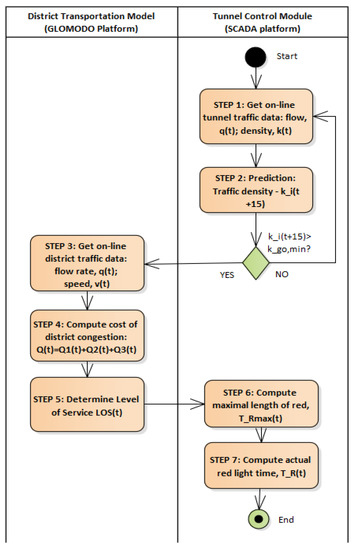 For simplicity, consider only two possible tunnel control scenarios—either the tunnel is open or closed . The main advantage of the intelligent tunnel as a smart city component is that the decision on the control strategy ( or ) is not made locally, but with regard to the financial impact of the whole district area. Described mathematically, control is carried out using two criterion functions: