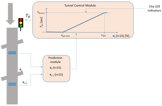 In the case of LOS = 1 (green), a full interval will be used for urban tunnel control according to occupancy prediction, as it is shown in Figure 13. In case of LOS = 2 and LOS = 3, the maximum of interval will be reduced accordingly. STEP 6 of the algorithm (see Figure 12) is based on the Equation (9):