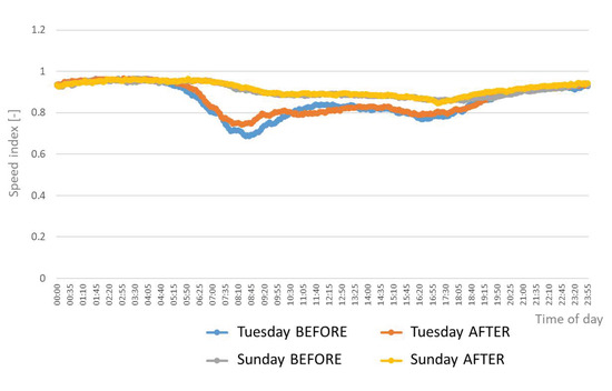 In this section, we demonstrate the effect of closing the tunnel Blanka using a BEFORE and AFTER analysis. Figure 14 shows the development of the speed index for one working day and one weekday before, resp. after the tunnel opening. The figure demonstrates that the speed index dropped more substantially before opening of the tunnel Blanka.