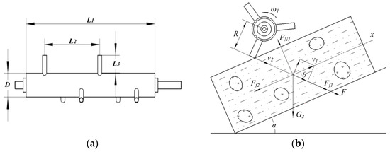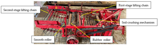 - The rotational speed of the soil-crushing mechanism. The rotational speed of the soil-crushing mechanism impacted the soil-crushing quality and the damage degree, as determined by the kinetic analysis of potato-soil mixture in the shearing area. The rotational speed of the soil-crushing mechanism was adopted as one of the orthogonal test factors to identify optimal running parameters of the soil-crushing mechanism. During the trial, three levels of the rotation speed of the soil-crushing mechanism were set to 70 r/min, 122 r/min, and 175 r/min, respectively. The linear velocity at the tip of the soil-crushing roller tooth was equated with that of the first-stage lifting chain at the rotation speed of the soil-crushing mechanism as 70 r/min.