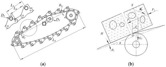 - The inclination angle of lifting chain. The inclination angle of the first-stage lifting chain set in this separation device was equated with that of the second-stage lifting chain. Given the kinetic analysis, as previously described, the inclination angle of the lifting chain had effects on the force and motion state of potato-soil mixture in the shearing area, the bending area, the throwing area, and the conveying area to identify the optimal inclination angle of lifting chain, that was employed as one of the orthogonal test factors. During the trial, three levels of the inclination angle of lifting chain were set to 15°, 20°, and 25°, respectively.