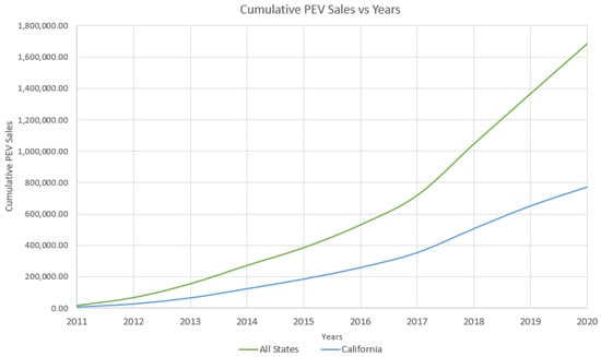 As cities expand and populations increase, the amount of available fossil fuels decreases and air quality laws are made stricter [1]. Thus, Zero-Emission Vehicles (ZEV) become a more appealing answer to future transportation problems [2,3,4]. California has initiated measures to encourage the adoption of ZEVs, to have at least 5 million ZEVs on the road by 2030 to reduce emissions from transportation sources [5]. Battery electric vehicles (BEVs), fuel cell electric vehicles (FCEVs), and plug-in electric vehicles (PEVs) are the three types of ZEVs [6]. Since 2011, almost two million PEVs have been sold, with California accounting for nearly one-third of all sales, shown in Figure 1 [7,8,9]. However, increased PEV adoption will lead to disturbances in the electric grid because of power demands exceeding the grid’s initial design conditions [10,11,12,13,14].