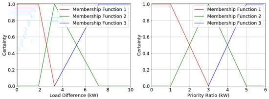 Both values are used as inputs and return an output of 1, 2, or 3, corresponding to small, medium, and large membership functions, shown in Figure 3. These classifications are used to group similar values of load difference and priority ratio together. The load difference membership functions are created using 1.9, 3.3, and 7.2 kW as the center of the three triangle membership functions, respectively. These three rates are used to determine if there is a small, medium, or large difference between the load and load limit. Ramos Muñoz et al. [46] use 3.3 and 7.2 kW in their study, and to maintain parallelism, both of these rates are used. An additional rate of 1.9 kW, is used because, in reality, charging rates below 3.3 kW exist. Not incorporating lower rates limits the algorithm’s performance, reducing its ability to charge vehicles when the baseload is near the load limit. Through observation, values of 1, 3, and 5 were determined to be ideal numbers for the centers of the priority ratio membership functions.