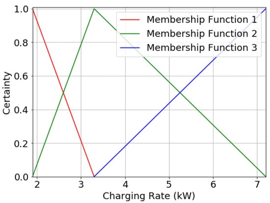 The numerical values 1, 2, and 3 are used to represent the output values of “small,” “medium,” and “high.” For example, if the load differential is 3 (large) and a vehicle is assigned a priority ratio of 2 (medium), the vehicle will be charged at a rate of 3. (large). The output is assigned to a membership function, which calculates, , the output rate for the connected vehicle, using the “center of gravity” (COG) approach, as indicated in Equation (7).