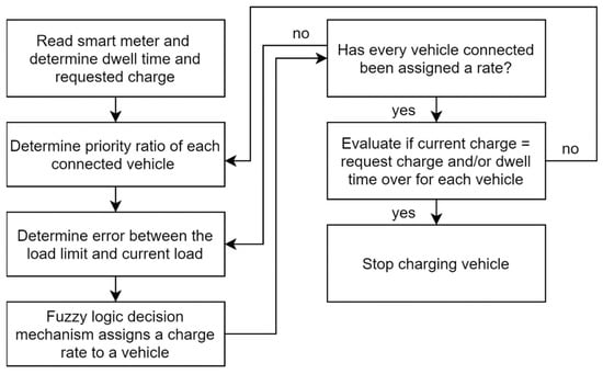To react to sudden changes in the baseload, ARVF needs to be capable of changing the charging rates it is delivering to vehicles. For example, suppose the baseload suddenly increases. In that case, the algorithm can decrease the rate that is being delivered to a vehicle. If the baseload suddenly decreases, the algorithm can increase the rate that is being delivered to a vehicle. This attribute is implemented in this study by assuming ARVF can charge vehicles at any rate between 1.9 and 7.2 kW. Fuzzy logic is used to determine the rate delivered to vehicles because of its inheritability to tolerate the concept of partial truth, where the truth value may range between completely true and completely false, much like the range of the rates administered to charging vehicles [50,51]. This allows ARVF to deliver rates that range from 1.9 to 7.2 kW in a continuous spectrum to vehicles based on their needs. In addition, fuzzy logic is selected for this application because it can optimize nonlinear systems, operates in real time, scales efficiently, and is not computationally expensive. These characteristics are important for an algorithm being used in real-world applications.