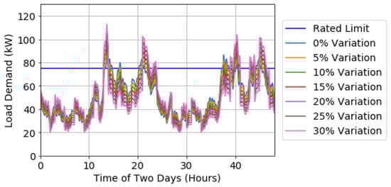 The demand curves that are referred to as actual baseloads are generated by varying the forecasted baseload by a scaled percentage. A column vector of 48 by 1 is used to represent the 48 1 h sections in the baseload. A random number generator fills the cells with a 0 or 1, where cells that receive a 0 are decreased by a scaled percent value, and the cells that receive a 1 are increased by the same percentage. This is used to simulate the variation in an hourly fashion between the forecasted and actual baseload. Seven actual baseloads are analyzed, the variations ranging from 0% to 30% in 5% increments. Figure 6 below illustrates the forecasted (0% variation) and the six other actual baseloads used in this paper.