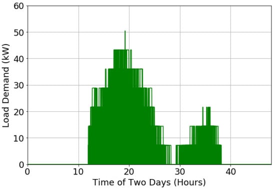 The transformer data utilized in this study were captured on 25 September 2014, from a 75 kW home transformer in Irvine, California, and will be used to model the forecasted demand. The day’s minimum and maximum temperatures were 22.2 degrees Celsius (72.0 degrees Fahrenheit) and 31.1 degrees Celsius (88.0 degrees Fahrenheit), respectively. The baseload on the transformer is the demand before any PEV charging demand is applied. The transformer referenced in this study provides power to 20 homes, whose square footage ranges from 1900 to 2900 square feet. In this analysis, electric vehicle charging was not included in the transformer baseload and data were sampled in 5 min intervals.