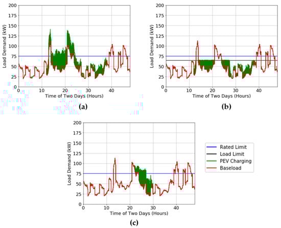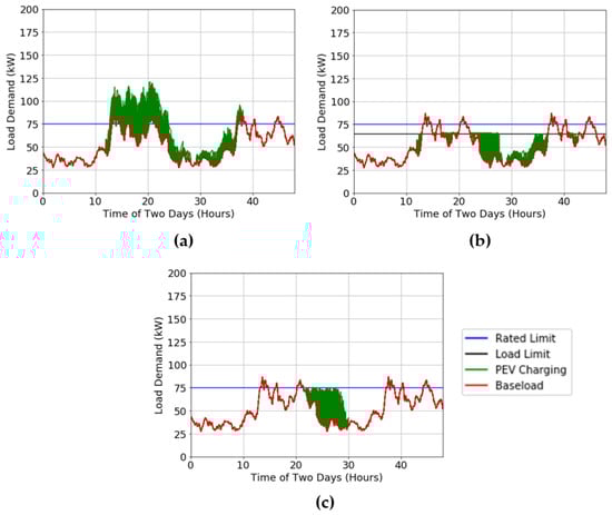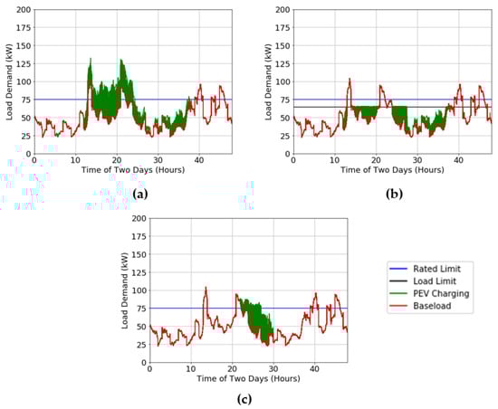 Cases 1, 2, and 3 do not charge all vehicles greater than or equal to 90% of the total amount of energy that the vehicle requested, shown in Table 2, and are eliminated from plausible load limits. Further analyzing cases 4, 5, 6, and 7, Table 3 shows each case’s ability to reduce the average load during charging. Moreover, this table proves that case 4, equating the limit load to the average baseload plus 0.75 of its standard deviation performs best, reducing the average load during charging by 16.53%.