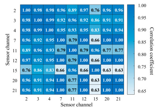 The dataset used in this part to verify the effectiveness of the proposed method was the simulation data of turbofan engine from NASA Ames Prognostics Data Repository which was built by Saxena et al. based on the Commercial Modular Aero-Propulsion System Simulation (CMAPSS) [34]. As the simulation model accurately reflected the degradation law of the turbofan engine, the simulation data can effectively reflect the degradation of the turbofan engine under different failure modes. There were four sets of life cycle data in the simulation data, the information of operating condition and failure mode simulated by each set of data were shown in Table 1. Further, each set of data contained two subsets, namely the train set, and test set, the train set contained the complete life cycle of turbofan engines. In this part, only the train set of Set #2 and #4 was used to verify the proposed method. According to [25], the meaning of each column of data of each life cycle data in Set #2 and #4 was shown in Table 2. In addition, only the monitoring data of Sensor Channels 2, 3, 4, 7, 11, 12, 15, 20, and 21 were sensitive to the fault of the turbofan engine and had an obvious degradation trend [16,25]. However, there may be information redundancy among the monitoring data of each sensor channel. Therefore, cross calculate the correlation between the monitoring data of Sensor Channels 2, 3, 4, 7, 11, 12, 15, 20, and 21, and the results were shown in Figure 3.