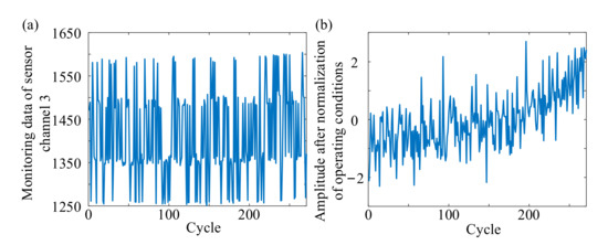 The traditional STM usually extracted the degradation model (degradation trend) of the monitoring signal to eliminate the influence of noise and other random fluctuations on the overall degradation trend of equipment. However, as shown in Figure 4a, for some monitoring signals, when the equipment was operating under multiple operating conditions, the monitoring signals were affected by different operating conditions. Further, the obvious degradation trend cannot be seen from the monitoring signal. Therefore, according to [25], the influence of operating conditions on the degradation trend of monitoring signal was eliminated by normalization of operating conditions as follows: