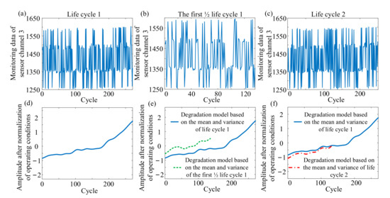 Through the operating condition normalization, although the normalized monitoring signal of the operating condition can show an obvious degradation trend, the mean and variance of each operating condition needed to be known in the process of operating condition normalization. Therefore, this brought a problem, for the equipment in service, how to determine the mean and variance of each operating condition. Generally, there were two solutions: (1) the mean and variance were from each operating condition of service equipment in-service stage; (2) the mean and variance were from each operating condition of historical life cycle data. However, the mean and variance obtained by the two solutions were different from those of each operating condition after the complete failure of service equipment. As shown in Figure 5, the degradation model of the first half of Life Cycle 1 was obtained by the mean and variance obtained from the abovementioned two solutions respectively. As shown in Figure 5b,c, the degradation model of the first half of Life Cycle 1 obtained by the mean and variance which came from the abovementioned two solutions was obviously different from that of Life Cycle 1 obtained by the mean and variance of each operating condition of the whole life. This difference existed not only in shape but also in amplitude. Therefore, for the service equipment, the degradation model of monitoring data in-service stage cannot be accurately obtained under multiple operating conditions, which was an important problem encountered in using STM for life prediction under multiple operating conditions.
