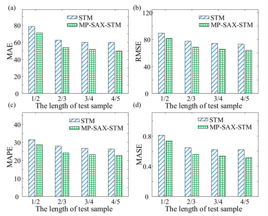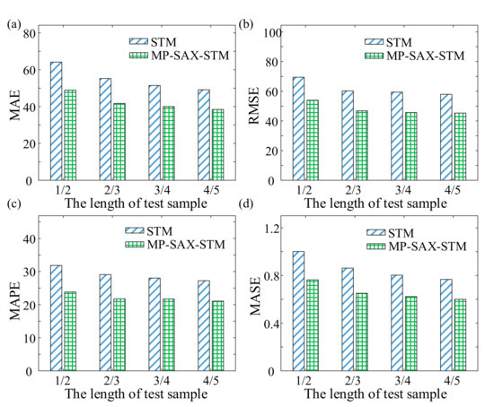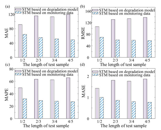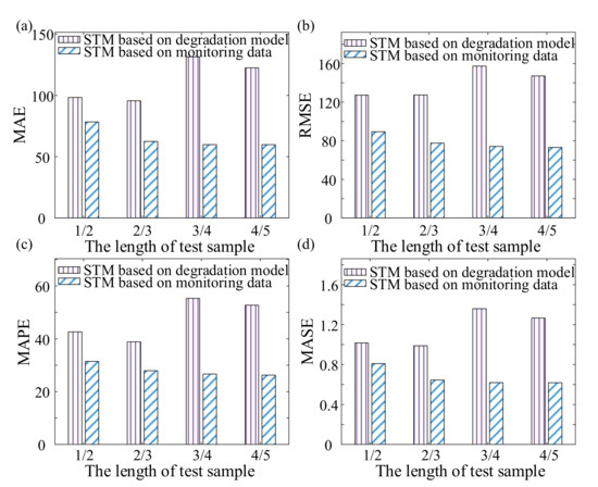 Consequently, the proposed method improved the life prediction results under multiple operating conditions by improving the accuracy of direct measurement of monitoring data similarity. Likewise, 30 sets of life cycle data from Set #2 and Set #4 were selected randomly respectively, then the first 1/2, 2/3, 3/4, and 4/5 of the selected life cycle data were used as the test samples. Finally, MP-SAX-STM was used for life prediction and compared with the prediction results of STM which was based on original monitoring data, and the MAE, RMSE, MAPE, and MASE were calculated as shown in Figure 8 and Figure 9. Where the subjective weight determination method was selected when calculating the similarity by MP-SAX, in which the weight of trend component is 0.75 and the weight of detail component is 0.25.