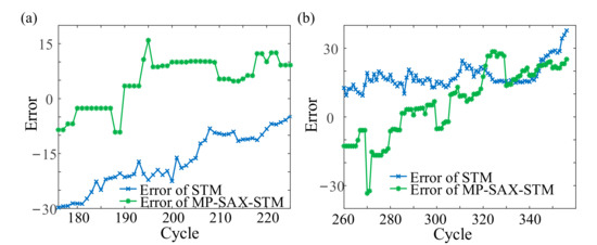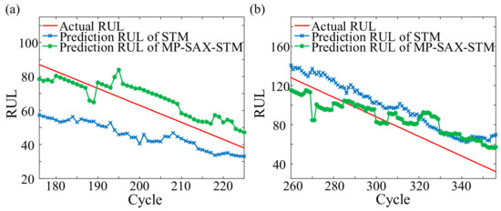 Compared with STM, as shown in Figure 10, both the MP-SAX-STM RUL prediction results of Set #2 and Set #4 were closer to the actual RUL. Therefore, under multiple operating conditions, the life prediction can be effectively realized by MP-SAX-STM even if the degradation model was not extracted and only the monitoring data which was sensitive to the operating condition was used. In addition, as shown in Figure 11, for Set #2, the RUL error of MP-SAX-STM fluctuated around 0, while the error of STM was much less than 0 and gradually approached 0. For Set #4, although the overall trend of the error of MP-SAX-STM passed through 0, the error of STM was always greater than 0. Therefore, for the life prediction problem under multiple operating conditions, MP-SAX-STM can improve the prediction accuracy compared with STM.