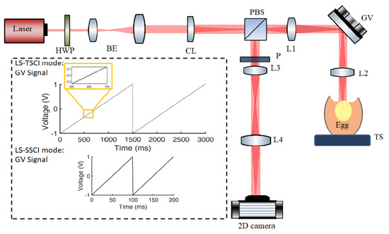 Particularly, different from previous acquisition modes, the system has been upgraded to three imaging modes. One is surface illumination laser speckle contrast imaging (SI-LSCI). The other two are line scan temporal speckle contrast imaging (LS-TSCI) and line scan spatial speckle contrast imaging (LS-SSCI). As illustrated in the black dashed box in Figure 1, in LS-TSCI mode, the galvo mirror is driven by a periodic stair-step waveform; in LS-SSCI mode, the galvo mirror is driven by a periodic sawtooth wave signal, which varies linearly with time in each frame period. Both in LS-TSCI and LS-SSCI mode, the sensing element of the camera is conjugated to the illumination line. In LS-TSCI mode, assuming that the number of steps per frame is 100 and the width of each step is 15 with the exposure time 1 ms, 15 consecutive raw speckle intensity data can be used to calculate one temporal speckle contrast. Thus, it will take 1500 ms to acquire one speckle image. In LS-SSCI mode, assuming that the number of lines per frame is 100 and the integral time of line camera is 1 ms, it will take 100 ms to obtain one speckle image. In the experiments, a data acquisition board (NI, PCI-6115) was used to produce both the trigger signals and the driving waveform of the galvo mirror to synchronize the galvo mirror to the camera. We designed a homemade LabVIEW program for hardware control and image acquisition.
