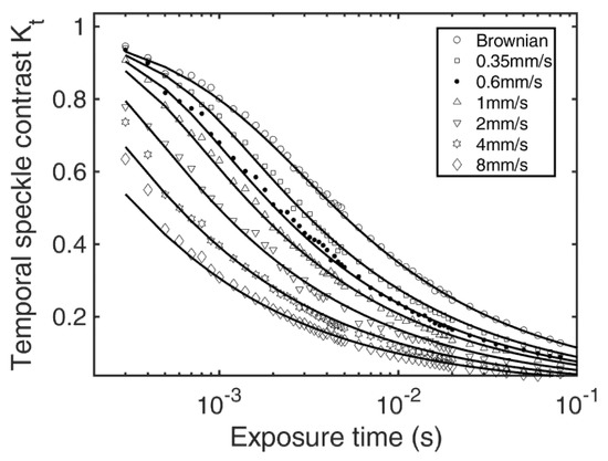 Measured temporal speckle contrast of flow phantom (data points) and corresponding fitting results (solid lines) for different flow velocities using LS-TSCI setup.