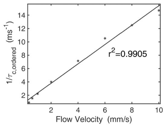 Dependence of fitting parameter τc,ordered (plotted as 1/τc,ordered) obtained from the speckle contrast and flow velocities. The linear correlation coefficient is 0.9905.