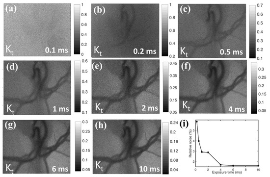 The exposure time is a freely selectable parameter, but the choice of the integration time has a great influence on the calculated contrast values (shown in Figure 4). To choose the proper integration time for imaging the blood flow of chick embryos, multi-exposure laser speckle contrast imaging was studied. Figure 4 shows the temporal speckle contrast images of a chick embryo (NO.1 day 3) obtained with the SI-LSCI at different exposure durations of 0.1, 0.2, 0.5, 1, 2, 4, 6, and 10 ms, respectively. All speckle contrast images in Figure 4 are obtained by imaging the same region of the chick embryo. With a short exposure durations of 0.2 ms (Figure 4b), the laser speckle contrast image shows the blood vessels with fast flow velocity around the heart. Meanwhile, with a shorter exposure duration of 0.1 ms (Figure 4a), the contrast image shows nothing. The vessels are invisible in the image. With a longer exposure duration of 10 ms (Figure 4h), the speckle contrast image highlights the blood vessels with slower flow velocity further away from the heart. The experimental results demonstrated that the smaller vessels, which have a lower flow velocity, become more apparent with the increasing exposure time. A quantitative analysis is provided in Figure 4i, where the relative noise σK/K in the speckle contrast images is plotted as a function of the exposure time. It shows that the image noise at the exposure time 4 ms is very close to that of 10 ms. Therefore, 4 ms is a near-optimal compromise between the image quality and the image acquisition speed for LS-TSCL and LS-SSCI.