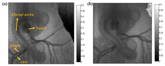 After the optimum exposure time was determined, we compared the performances of LS-TSCI and LS-SSCI. Figure 5a,b shows the temporal speckle contrast image and spatial speckle contrast image of chick embryo (day 3.5, NO. 2) using LS-TSCI and LS-SSCI at line exposure durations of 4 ms, respectively. The results demonstrate that LS-TSCI and LS-SSCI were essentially identical, but due to the poor temporal resolution, LS-TSCI is sensitive to motion artifacts due to heartbeats, particularly around the heart, dorsal aorta, and artery (shown in Figure 5a). Though spatial sampling in LS-SSCI reduces the spatial resolution, LS-SSCI maintains high temporal resolution, and is less affected by motion artifacts. Consequently, LS-SSCI can provide better image quality for the in vivo imaging blood flow of chick embryos than LS-TSCI.
