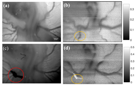 LS-SSCI was employed to observe blood flow changes during the vascular clipping of chick embryos. Chick embryo (day 3, NO. 3) was used for the experiment. A silk suture (Ethicon, w1814, shown in Figure 6c using the red circle) was used for the vascular clipping. Figure 6a,c shows the wide-field image with white light illumination before and after the clipping, respectively. Figure 6b,d shows the corresponding speckle contrast image using LS-SSCI before and after the vascular clipping, respectively. The difference between Figure 6b,d is illustrated in the figures using the yellow circles. The vessel in the yellow region indicated in Figure 6b can be clearly seen, but this vessel is invisible in Figure 6d. The observations demonstrated that the clipping caused a severe reduction in blood flow in the regions of almost 100%. The experimental results proved that LS-SSCI shows great potential in diagnosing vascular diseases, such as angiosclerosis, angiostenosis, or angiemphraxis.
