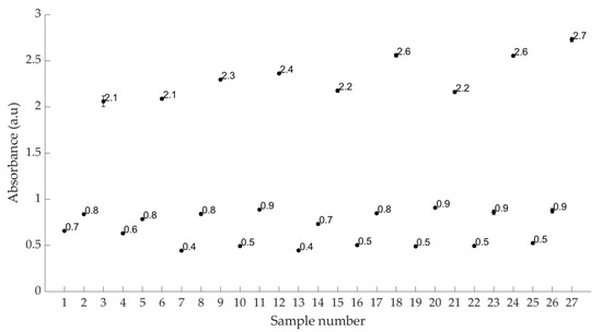 The nanoparticle UV–Vis absorbance at 204 nm (this peak is observed for all 81 samples), mean diameter, and colloidal density (mg/mL) are shown in Figure 1, Figure 2, Figure 3, respectively, for each of the 27 sample groups. It was observed that all the inputs (ablation time, fluence and scan speed) have some influence on the outputs (nanoparticle size distribution, mean nanoparticle diameter, absorbance and colloidal density (mg/mL)). This section will examine the effect of each input on the outputs individually. The section will examine the trends in nanoparticle size distributions; particularly three types of distributions were observed: normal, positively skewed and bimodal distributions. Figure 1 shows a clear pattern in absorbance and sample number. This is attributed to ablation time; the absorbance increases with ablation time at any combination of processing parameters examined in this study as per the 3 × 3 full factorial DOE (Table 1). A high absorbance is an indication of a high number of nanoparticles. The scan speed and the fluence do not affect the UV–Vis absorbance of the colloids as much as ablation time; however, they still have an effect as evident by comparing various samples synthesised at the same ablation time showing different absorbance values (e.g., samples 3 and 27 in Figure 1). The overall absorbance seems to increase from left to right signifying proportionality with laser fluence which increases after every nine samples (see Table 1 for DOE). A general increase in absorbance is observed from left to right in Figure 1 demonstrating a direct proportionality with scan speed which increases after every three samples (for every nine samples from left to right).