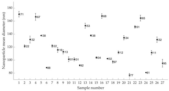 Mean nanoparticle diameter per sample group (1–27) (95% CI).