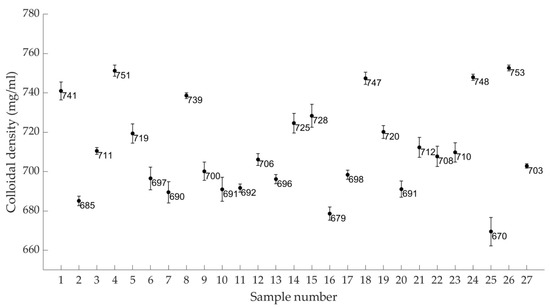 Mean colloidal density (mg/mL) per sample group (1–27) (95% CI).