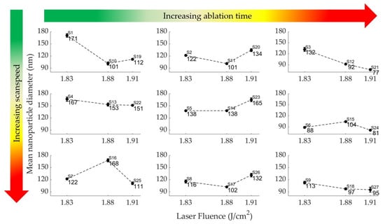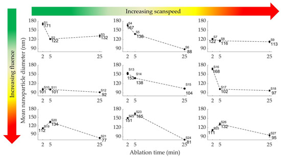 The nanoparticle diameter tends to decrease with increasing ablation time from 5 to 25 min; seven of nine sample sets exhibited this trend as shown in Figure 5. This trend is observed for all samples at medium-high scan speeds (3250–3500 mm/s) and/or medium-high laser fluences (1.83–1.91 J/cm2). High scan speeds enable a fast nanoparticle fragmentation; thus, the fragmented particles increase with ablation time and scan speed. A high fluence encourages fragmentation even at low scan speeds due to the increased energy density. On the contrary, an increase in nanoparticle diameter (at low scan speeds) with increasing ablation time from 2 to 5 min is observed for some samples (e.g., samples 19–20, and samples 22–23). This can be explained by the short ablation time that does not allow many fragmentations to occur and the low scan speeds that reduce the rate of nanoparticle fragmentation.