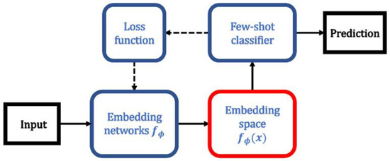 One of the representative methods for achieving this goal is the metric-based method which tries to find an appropriate metric for classification [8,9,10,12]. As shown in Figure 1, the overall structure of the metric-based method is largely composed of two modules: the embedding network and the few-shot classifier. During the learning phase, a deep network model learns to find an embedding function that maps raw inputs to feature vectors on the embedding metric space. The few-shot classifier then predicts the class of query data based on their similarity to the support data, which is measured on the metric space. The loss from the classifier is then transmitted for learning of the embedding network.