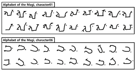 Figure 3 shows some examples of Omniglot data [34] which are a handwritten dataset for various characters. It consists of 1623 characters collected from 50 alphabets, and each character has 20 samples drawn by different individuals. We follow the procedure of Vinyals et al. [8] for data preparation and augmentation. The original data are resized to and rotated by multiples of 90 degrees. By rotating the existing image, we obtained four times as many classes as the original one. The embedding network with four convolutional blocks transforms an image into a 64-dimensional feature.