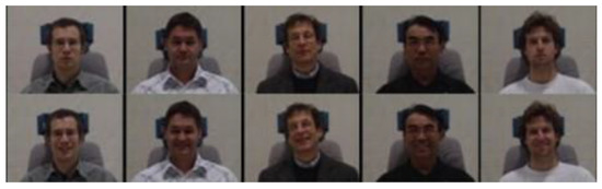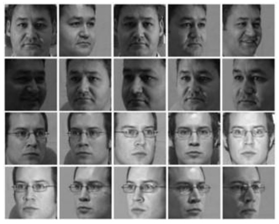 Figure 5 shows some examples of the Multi-PIE dataset that has been created as a benchmark for facial recognition. A total of 337 subjects participated in data collection, and shooting was conducted in four-time sessions. In the shooting, 20 patterns of lighting effects, 15 poses, and 6 types of emotional expression were mobilized, and over 2000 images were collected per subject in a one-time session. We transform the original data to suit the intention of the experiment according to the previous work [32]. The whole image is cropped so that only the face appears as shown in Figure 6. It is then converted to a black and white image and then resized to pixels. The Multi-PIE data have rather simple variations compared to the recent benchmark for face verification. However, considering that this experiment is conducted with the simple convolutional network with the purpose of verifying the effect of the probabilistic similarity, Multi-PIE data are appropriate in the sense that it assorted environmental variations such as illumination, poses, expression, and time sessions.