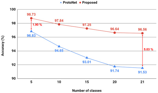 Figure 9 shows the change of accuracy according to the number of classes for the proposed method and prototypical network. In these practical data, the effect of probabilistic similarity is observed more clearly. Especially, the superiority of the proposed method becomes clearer as the number of ways increases. The results are consistent with the assumptions about the correlation between the number of ways and the accuracy. In order to verify the efficiency of the proposed method compared with state-of-the-art methods, we also conducted experiments for 1-shot classification according to [34]. Since the proposed method cannot obtain difference vectors set with a single support sample, episodic training was carried out with five support samples during the learning phase, and the covariance obtained from the train dataset was used for testing. From Table 2, we can see that the performance of the proposed method was higher than most conventional models except the VPE model with data augmentation, which is well-designed for the specific GTSRB data.