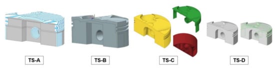 Geometry preparation requires the initial CAD model design to achieve the correct Design Space definition and the AlSi10 Mg alloy for PBF material definition. In particular, piston crown, pin housing, rings housings, and skirts are set to keep a minimum thickness. Figure 4 depicts the simplified model Geometry Preparation phase performed on the different TSs and it shows the different approaches for the Design Space and Non-Design space definition.